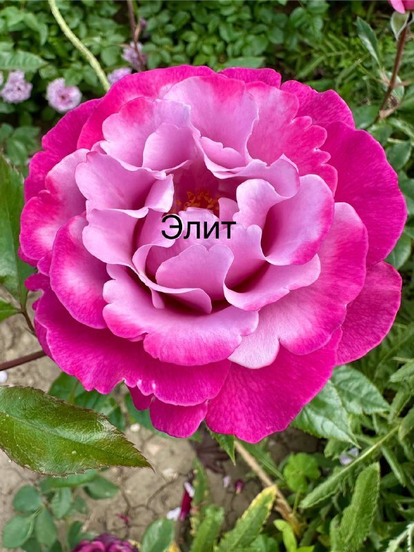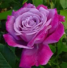 Бутоны округлые. Цветки пурпурно-лиловые с более тёмной каймой, к центру как будто покрытые белой пылью, махровые, на длинных цветоносах, одиночные или в рыхлых соцветиях. Аромат великолепный, очень сильный. Листья тёмно-зелёные, глянцевые, плотные. Кусты прямые, хорошо разветвлённые. Золотая медаль.