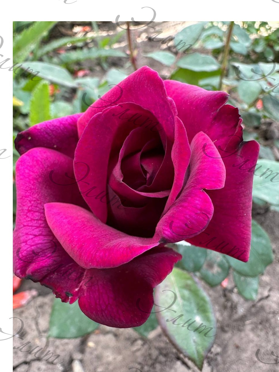 Компактная флорибунда с глянцевой, темно-зеленой листвой. Темно-пурпурные цветки с редкими белыми штрихами собраны в небольшие соцветия.