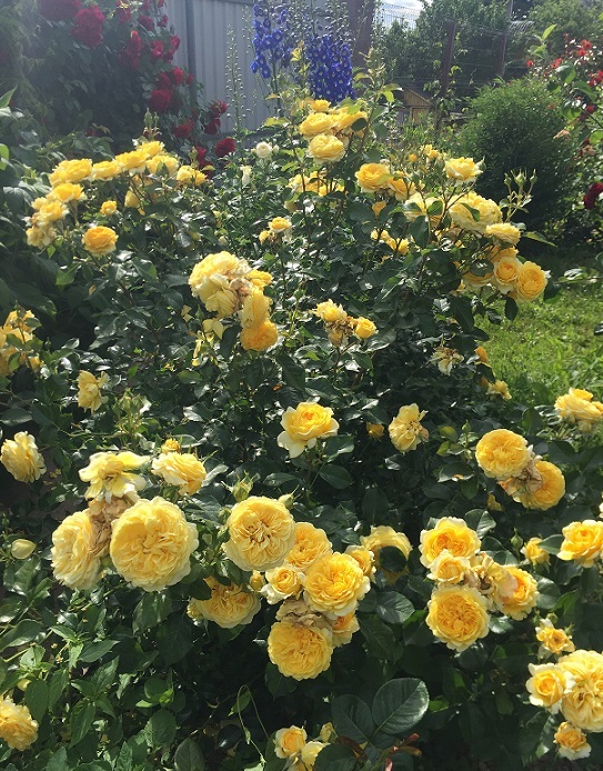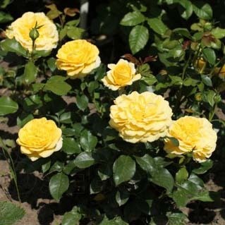 Цветки диаметром 6-8 см, густомахровые, ностальгические, золотисто-жёлтые, в соцветиях, очень стойкие, распускаются постоянно, обеспечивая золотое сияние в течение многих недель. Окраска цветков очень стабильная, даже при сильном солнечном освещении. Цветки самоочищающиеся. Цветение обильное. Листва устойчивая к мучнистой росе и чёрной пятнистости. Куст высотой 70-100 см