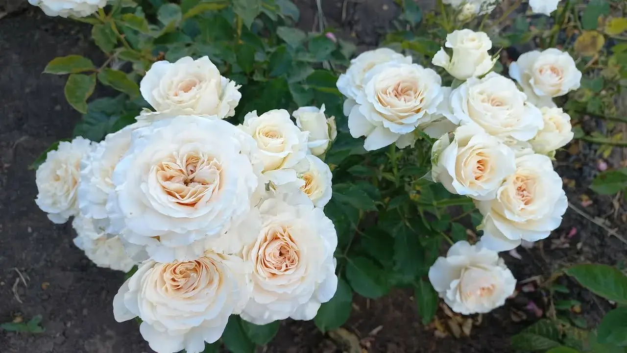 Густомахровые, умеренно душистые цветки этой розы можно назвать «кремовыми плюс», потому что сквозь общий тон проступает бледно-желтая, а иногда нежно-розовая дымка. Обильно ветвящийся куст с темно-зелеными листьями цветет все лето и осень