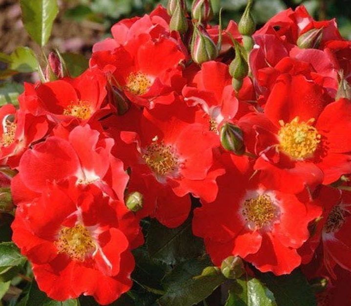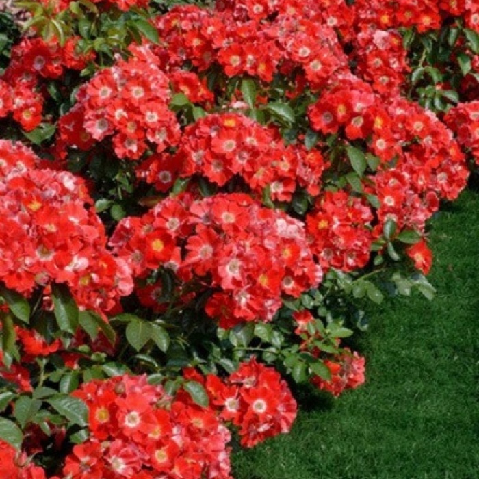 Ярко-красные цветки с богатым, насыщенным цветом, с белым глазком и золотистыми тычинками в его центре. Аромат лёгкий и нежный. Цветки собираются в крупные соцветия и долго не увядают, цветение обильное, почти непрерывное. Устойчивость к заболеваниям высокая.
