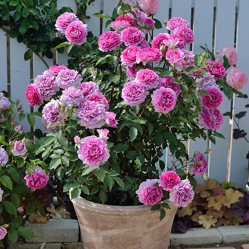 Цветки диаметром 8 см, махровые (26-40 лепестков), тёмно-розовые со смешанными розовыми и пурпурными оттенками, в соцветиях. Лепестки волнистые. Аромат сильный. Цветение повторное. Листья маленькие, матовые, высокоустойчивые к болезням. Побеги без шипов или почти без шипов. Куст компактный, высотой 70-90 см.