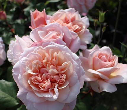Абрикосово-розовые душистые цветы появляются в небольших соцветиях в течение всего сезона. Листва темно-зеленая, блестящая. Кусты сильнорослые выносливые.